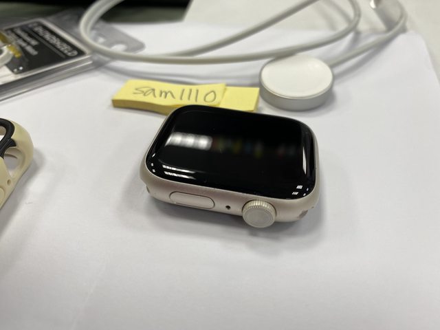 [型號] Apple Watch Nike S7 GPS 45mm 鋁 星光色 [規格] MKNA3TA/A A2474 [保固] 2021.11.04神腦購入,已過保 [盒裝配件] 完整盒裝,原廠配件齊全,說明書、充電線等都有 另附上犀牛盾保護殼 [售價] 6,500元整含店到店(開賣貨便) [交易方式/地點] 面交可在中壢後站的7-11,其餘可開賣貨便 [連絡方式] 站內信 [商品照/補充說明] 所有功能正常,電池健康度88%,洗澡、玩水、游泳都不會配戴 邊框有些微刮痕,錶帶有染色髒污,請參考照片