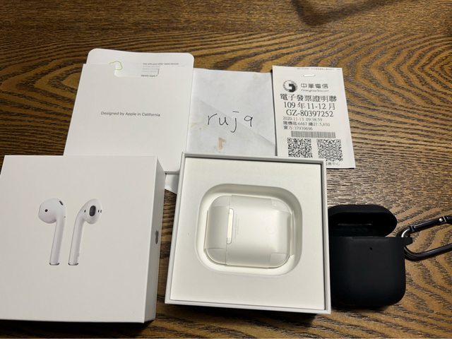 包裝盒、購買證明、充電盒及2耳機,充電線外觀不佳故不附,再附一個黑色矽膠套