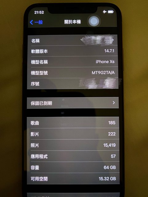 [型號] iPhone XS 64g 金 [規格] 64g [保固] 已過保 [盒裝配件] 附盒、無配件 [售價] 6000 [交易方式/地點] 桃園面交 [連絡方式] 站內信 [商品照/補充說明] 1.二手自用機,無使用後皆放防潮箱 2.電池健康度86% 3.四角皆無碰撞及傷痕