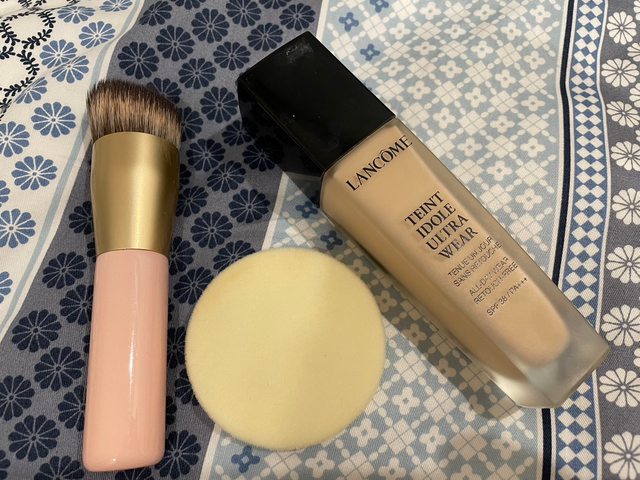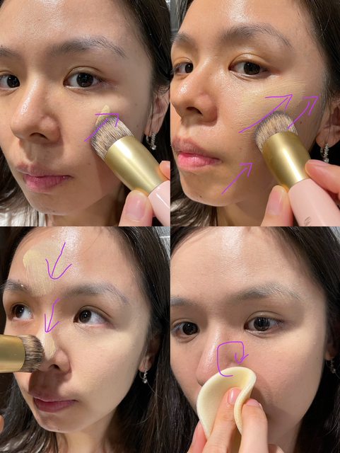 一開始先用粉底刷分區上粉底液,再用微濕的粉撲輕輕拍打拍勻