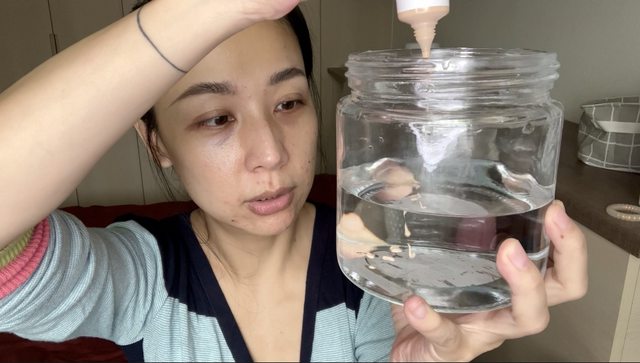 我先拿一個透明的玻璃罐,加水,然後把粉底液,擠進去,那樣子實在不美麗,散開,沾