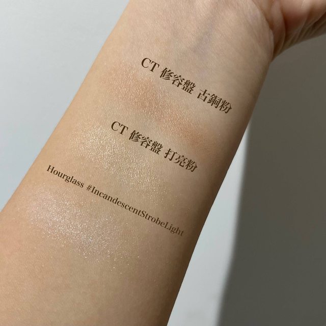 我非常非常非常愛這盤,因為它的古銅餅含珠光粉細緻,顏色略紅有Sun Kiss感,淺淺刷在臉頰非常健康自然,不會讓人覺得有壓力。而右邊的打亮閃度明顯比Hourglass 強,如果要追求非常細緻閃度的打亮會稍嫌不足,但整體而言已經有90分的水準,「強烈」推薦給追求古銅妝感的版友~