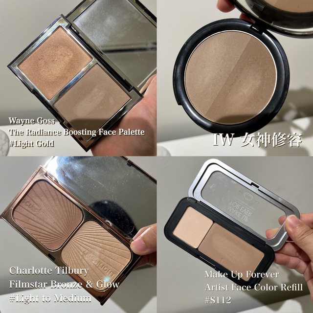 修容。MUF #S112 算是跟風買的,結果試完偏淺,比較適合白肌。CT跟WG的古銅粉都美到