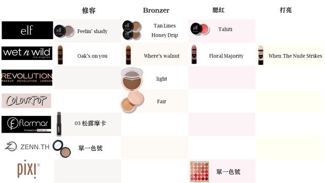 包含粉底、修容、腮紅、bronzer等