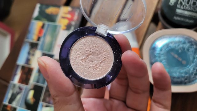 之前宇宙星光套組裡的,珠光非常閃亮好看,沒什麼底色,手上眼影盤裡只要沒有適合打