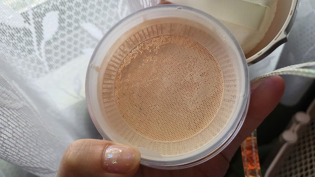 原本是孔狀的出口、現在改成篩網,我用粉撲沾,覺得不太上手,改用蜜粉刷就比較好取