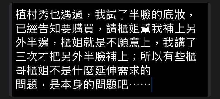 → schuey: 這次糟糕的體驗讓我懷疑櫃姐存在的必要性 36.231.73.172 10/03 09:49