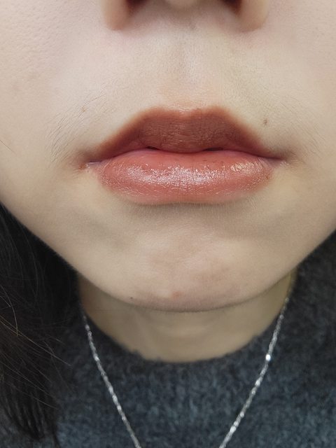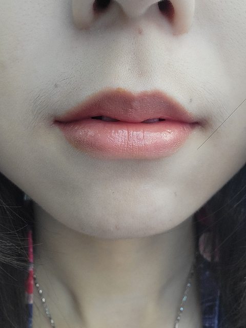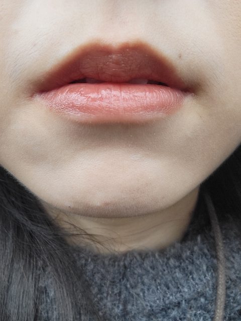 03在系列中偏橘調,上唇效果是杏色感,很適合搭配淡妝氣色會很好,但本身顏色較淡,
