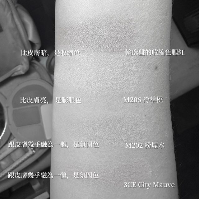 把顏色調成黑白之後,比皮膚暗就是收縮色反之就是膨脹色。跟皮膚差異不大的就是氛圍