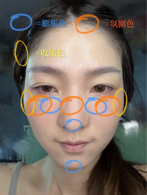 氛圍色:用來增加妝容一致性、氛圍感,可上在臉頰、鼻頭、下巴。顏色介於膨脹和收縮