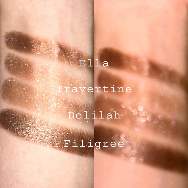 Filigree 最深的古銅色,偏向金屬感,但還是有夾帶一些亮粉,適合畫濃妝煙燻時使用
