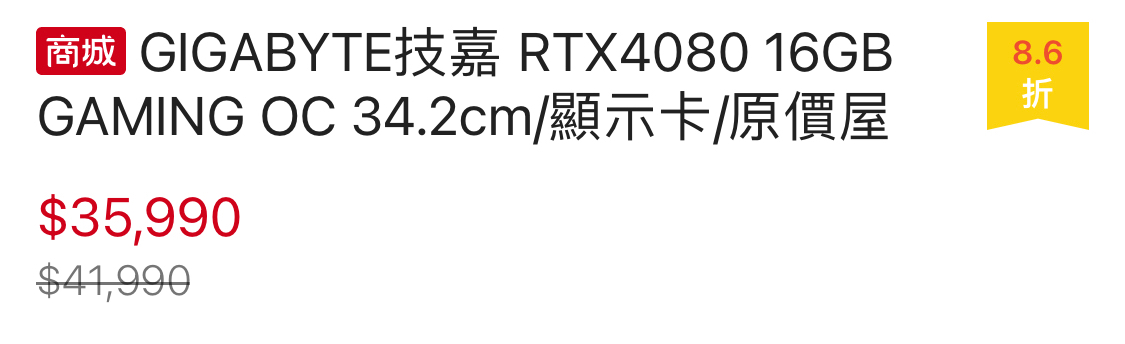 VGA (顯示卡):技嘉 RTX4080 16GB GAMING OC(2535MHz/34.2cm/五年)風之力散熱 $4,1990