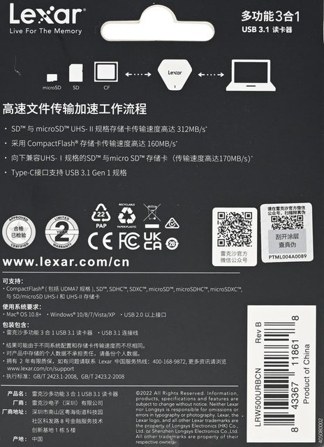雷克沙LEXAR RW500 Professional三合一USB3.1讀卡機支援SD、microSD和CompactFlash