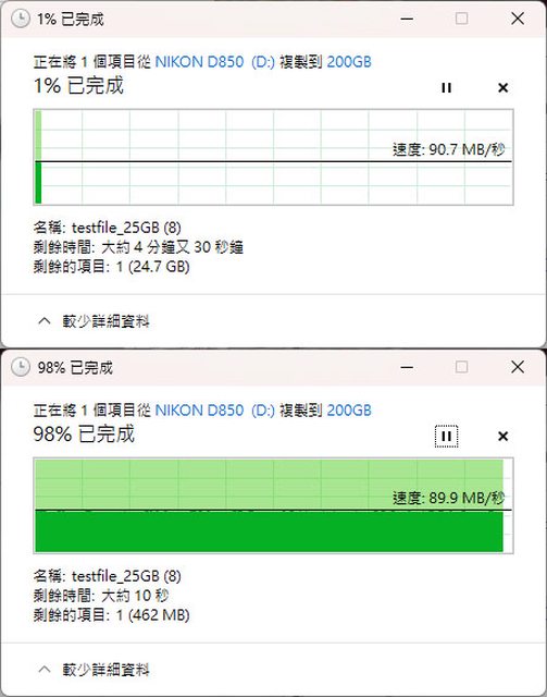 ▼從UHS-I規格SanDisk Extreme PRO 64GB SDXC記憶卡(95MB/s)拉1個25GB檔案寫入系統