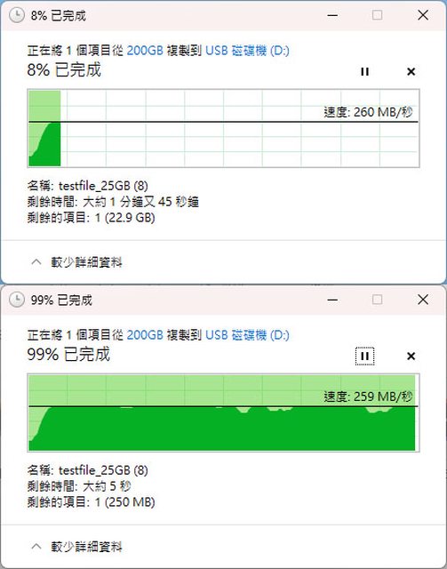 (300MB/s)時,維持在259至260MB/s的速度,中後段速度略有波動