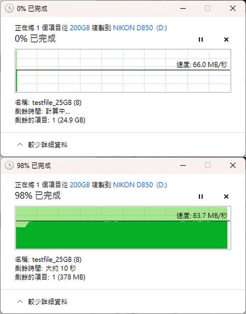 (95MB/s)時,傳輸速度一開始66MB/s,稍後上升至83.7MB/s