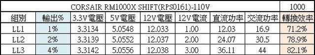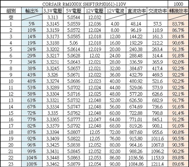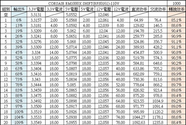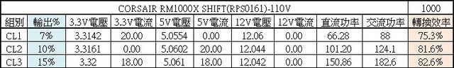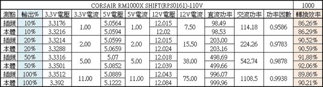 ○Corsair RM1000x Shift於20%/50%/100%下效率分別為90.52%/91.88%/89.86%,符合