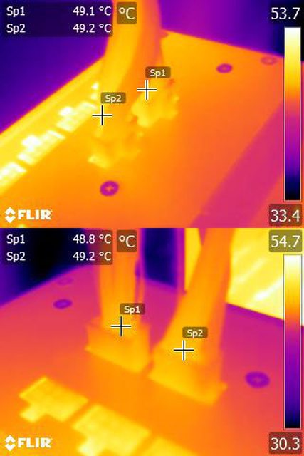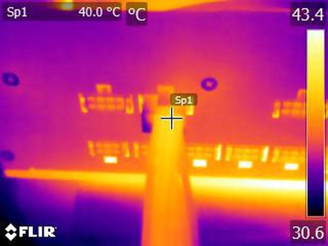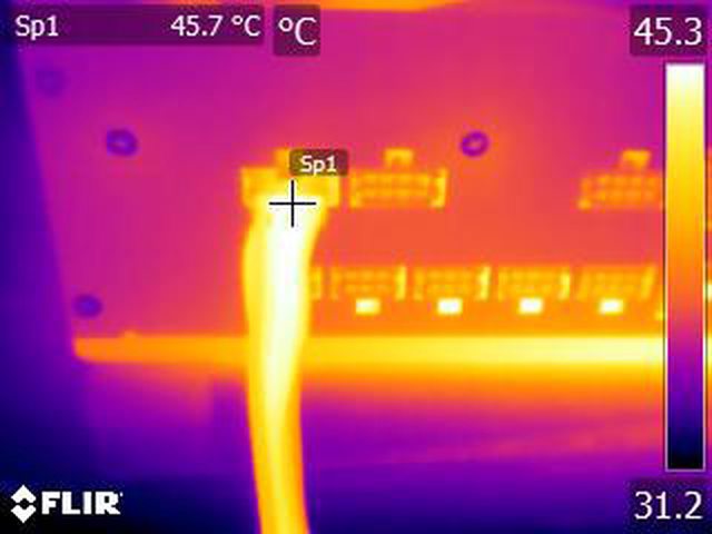 ▼執行FURMARK 30分鐘後,顯示卡端插頭的紅外線熱影像圖(附註:安裝位置環境溫度會