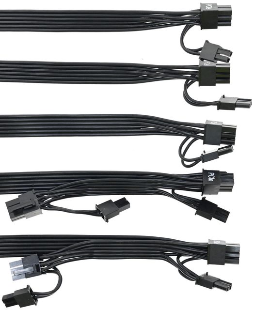 ▼5條顯示卡電源黑色帶狀模組化線路,提供7個PCIE 6+2P接頭,3條為單接頭配置,線路