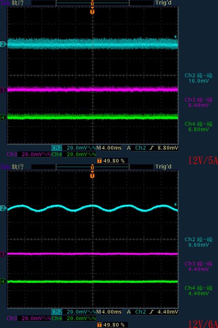▼輸出12V/5A時12V漣波波形改變。輸出12V/6A以上12V漣波波形固定,只改變振幅