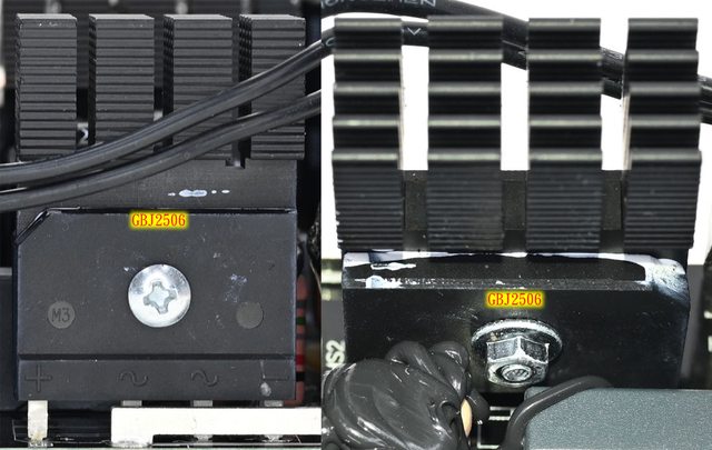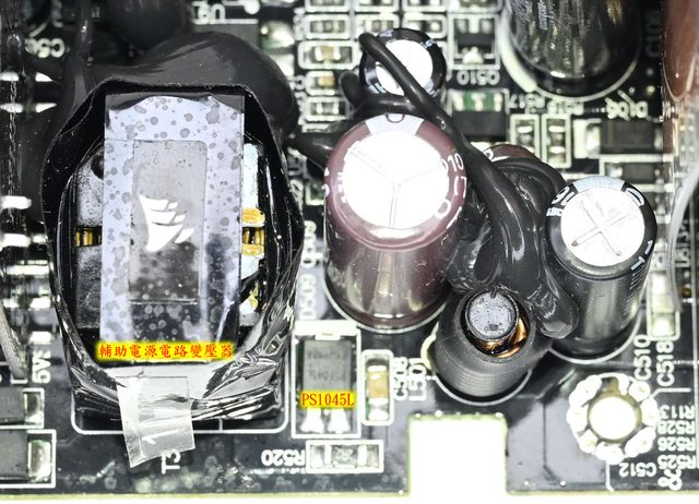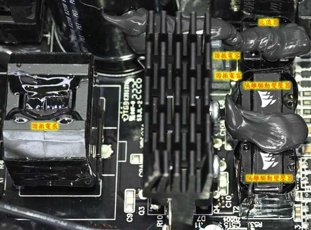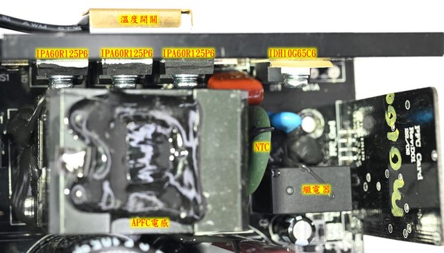 ▼電源供應器滿載輸出下橋式整流/APFC MOSFET/APFC DIODE/APFC電感(上圖)及一次側/