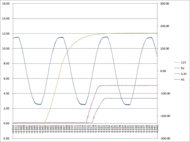 ○電源啟動至綜合全負載輸出狀態,12V上升時間24ms,5V上升時間5ms,3.3V上升時間
