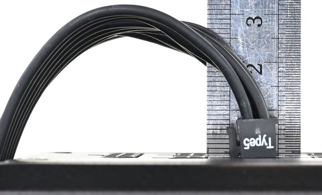 ▼12VHPWR模組化線路隨重力自然下垂,不施外力彎曲,其彎曲高度32mm