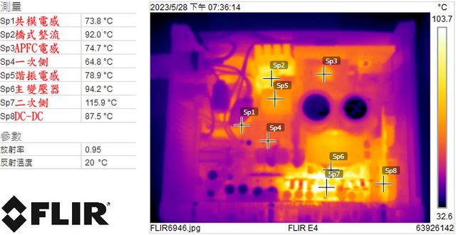 ▼電源供應器滿載輸出下內部的紅外線熱影像圖(附註:安裝位置環境溫度會影響測試結