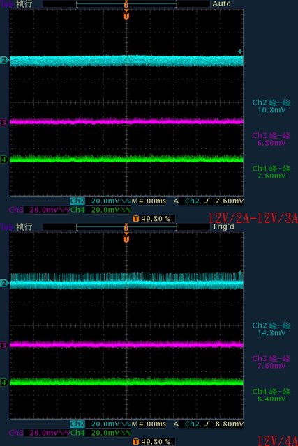 ▼輸出12V/2A至3A時12V漣波頻率增加。輸出12V/4A時12V漣波波形改變