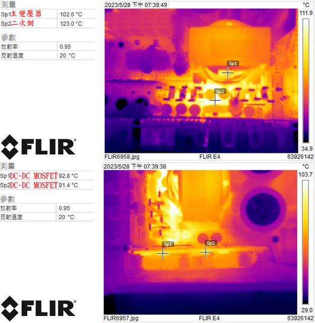 ▼電源供應器滿載輸出下主變壓器/二次側(上圖)及DC-DC MOSFET(下圖)的紅外線熱影像