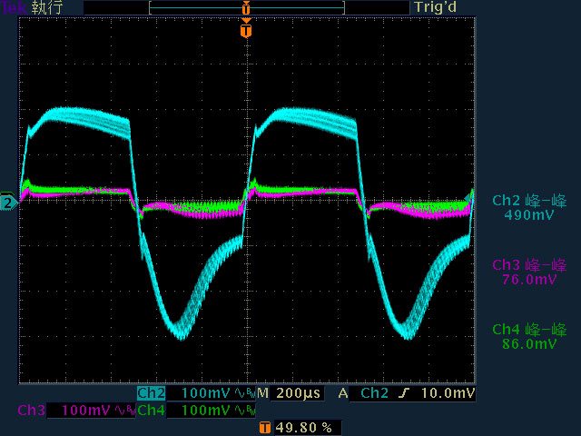 以下波形圖,CH2藍色波形為12V電壓波形,CH3紫色波形為5V電壓波形,CH4綠色波形為