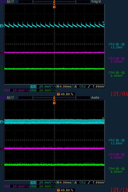 ○輸出無負載時12V有鋸齒狀漣波;輸出12V/1A至3A時12V漣波頻率增加;輸出12V/4A至5A