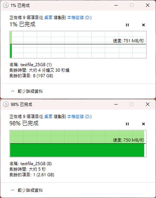 ▼從系統碟拉8個25GB檔案寫入,寫入速度維持在750MB/s