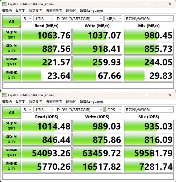 ▼CrystalDiskMark預設+R70%/W30% Mix測試結果