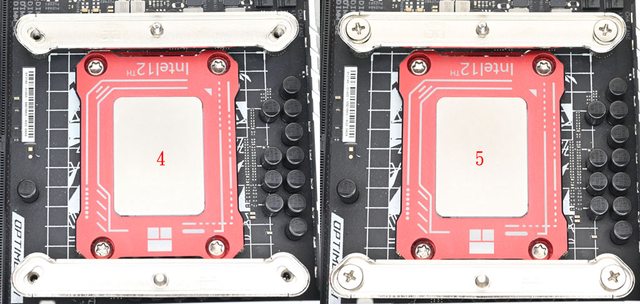 ▼LGA1700托架固定柱(左)為斜線壓花,LGA1200/115x托架固定柱(右)為直條紋溝槽,托