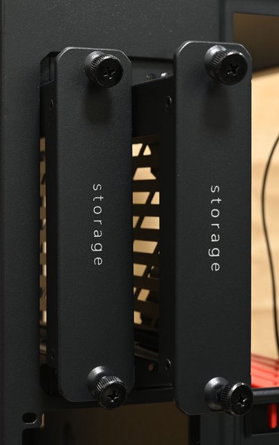 ▼機殼後方左上有2個上面標示Storage的抽取式3.5吋/2.5吋固定架,鬆開手轉螺絲後即