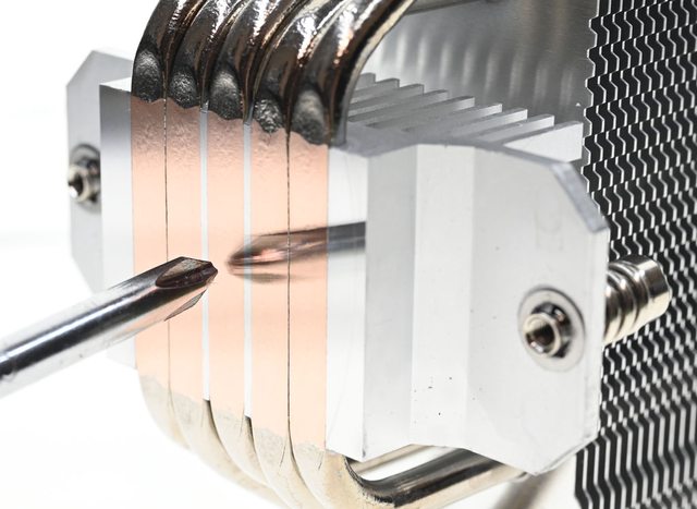 ▼散熱器下方鋁合金底座中間有鰭片,兩邊各伸出5支直徑6mm熱導管,並在熱導管上安裝