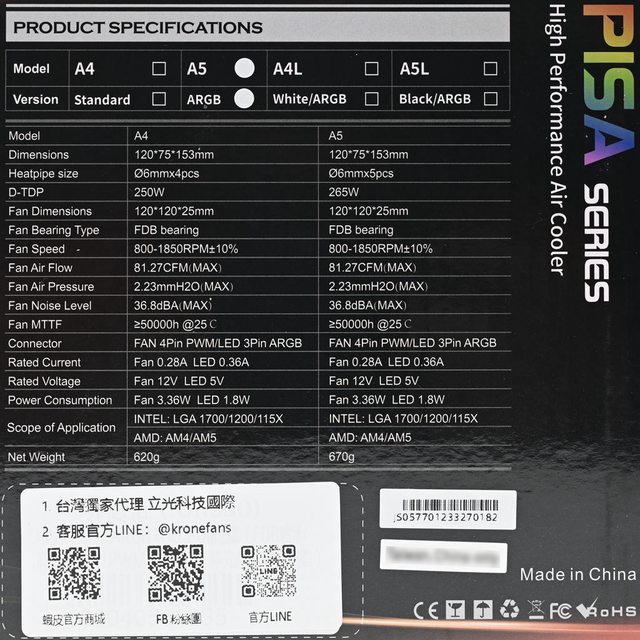 ▼此面外盒有商標、產品名稱、特色、PISA A5外觀圖、5V ARGB圖示