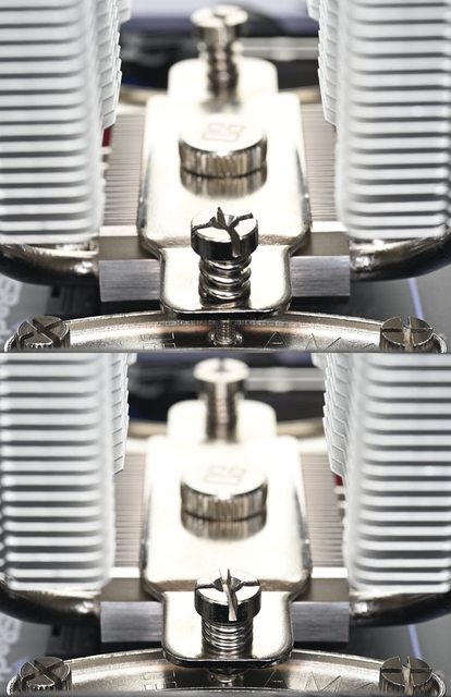 ▼從側面看,前塔及後塔下方10片散熱鰭片縮小,提供記憶體閃避空間,壓板中間用1個