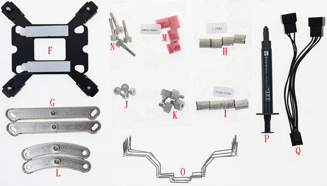 (M)、AMD托架固定手轉螺絲(N)、風扇固定線扣(O)、TF-7散熱膏(P)、1對2風扇分接線(Q)