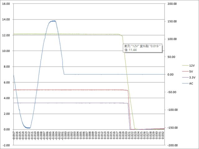 ○綜合全負載輸出狀態切斷AC輸入模擬電力中斷,12V於19ms降至11.44V