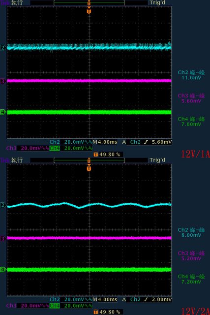 ○輸出無負載時12V有鋸齒狀漣波;輸出12V/2A以上12V漣波波形固定,只改變振幅。於綜