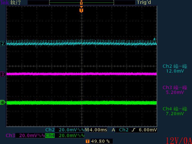 輸出下12V/5V/3.3V各路低頻漣波分別為15.6mV/16.4mV/15.2mV