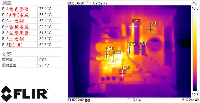 ▼執行FURMARK 30分鐘後電源端插頭的紅外線熱影像圖(附註:安裝位置環境溫度會影響