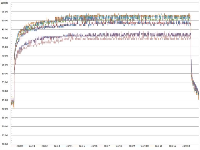 ▼高負載30分鐘CORE TEMP溫度記錄圖