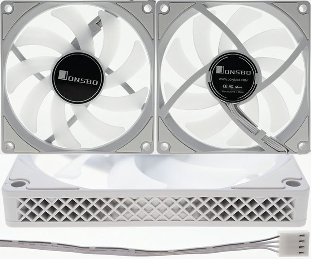 心標籤上有商標、網址、認證標誌、產地,風扇外框兩面的螺絲孔處有防震膠墊,風扇電