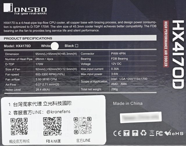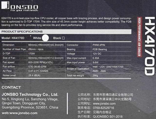 JONSBO喬思伯HX4170D下吹式散熱器規格: