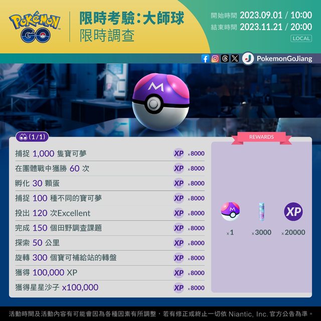 無法在台灣時間2023年11月21日(星期二)之前完成「限時考驗:大師球」的訓練家