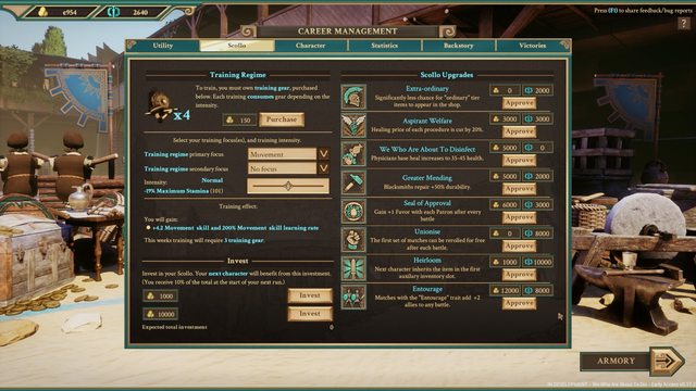 當結束戰鬥,返回修整後,玩家可以利用剛剛贏來的金錢與名聲這兩項資源來強化自身的
