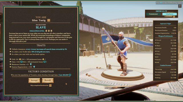 一個隨機生成的角鬥士,因為不同的原因投身競技場,歷經一場又一場的戰鬥,玩家的角